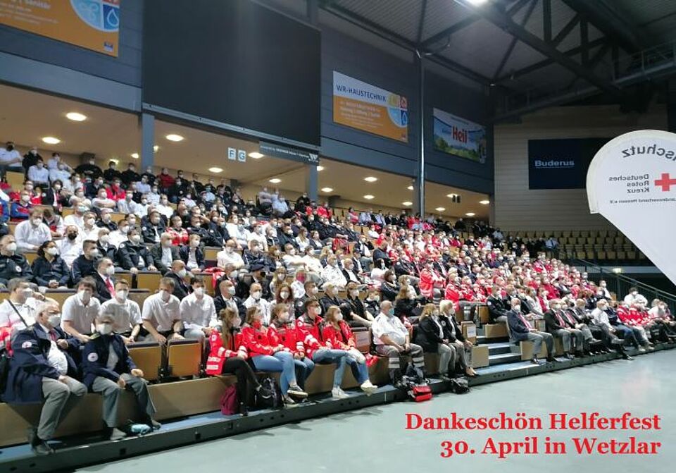 Wetzlar/Hessen – Mit einem Dankeschön-Helferfest feierte das hessische Rote Kreuz Ende April hunderte seiner Einsatzkräfte in der Buderus Arena in Wetzlar. Von den 1.083 Freiwilligen, die im Sommer 2021 in der Hochwasserregion im Ahrtal im Einsatz waren, trafen sich 530 Rotkreuzlerinnen und Rotkreuzler am 30. April in Mittelhessen. Sie erhielten eine gemeinsame Urkunde er DRK-Landesverbände Nordrhein e.V., Rheinland-Pfalz e.V. und Westfalen-Lippe e.V. als offizielle Würdigung ihres außerordentlichen Engagements im vergangenen Sommer während der Hochwasserkatastrophen in Rheinland-Pfalz und in Nordrhein-Westfalen. Die dazugehörige Bandschnalle wird aufgrund von Lieferschwierigkeiten leider erst später nachgeliefert.