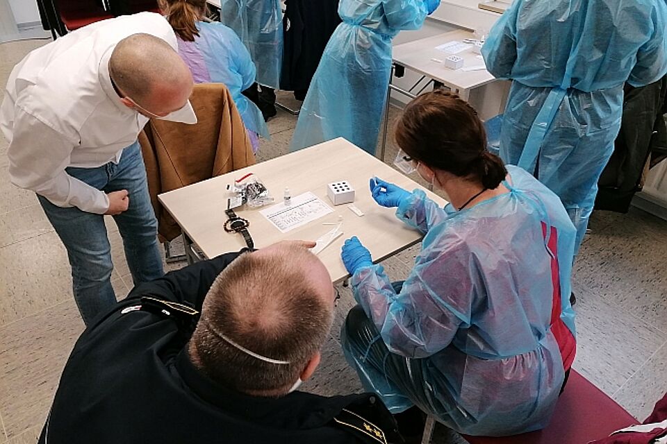 Die Kursleitung hatte der stellvertretende Schulleiter Stefan Seeger inne. In der ersten Kursgruppe wurden zehn Rotkreuzlerinnen und Rotkreuzler aus Wiesbaden, der Bergstraße und dem Rheingau-Taunus im Anlegen der Schutzausrüstung und in der Durchführung des PoC-Antigentests geschult. Andere Multiplikatoren aus weiteren hessischen DRK-Kreisverbänden werden in den nächsten Tagen folgen. Die Multiplikatoren werden in ihren eigenen Kreisverbänden ehrenamtlich die derzeit eintreffenden Bundeswehr-Angehörigen in Hessen schulen, die die Testungen in den Alten- und Pflegeheimen durchführen werden.