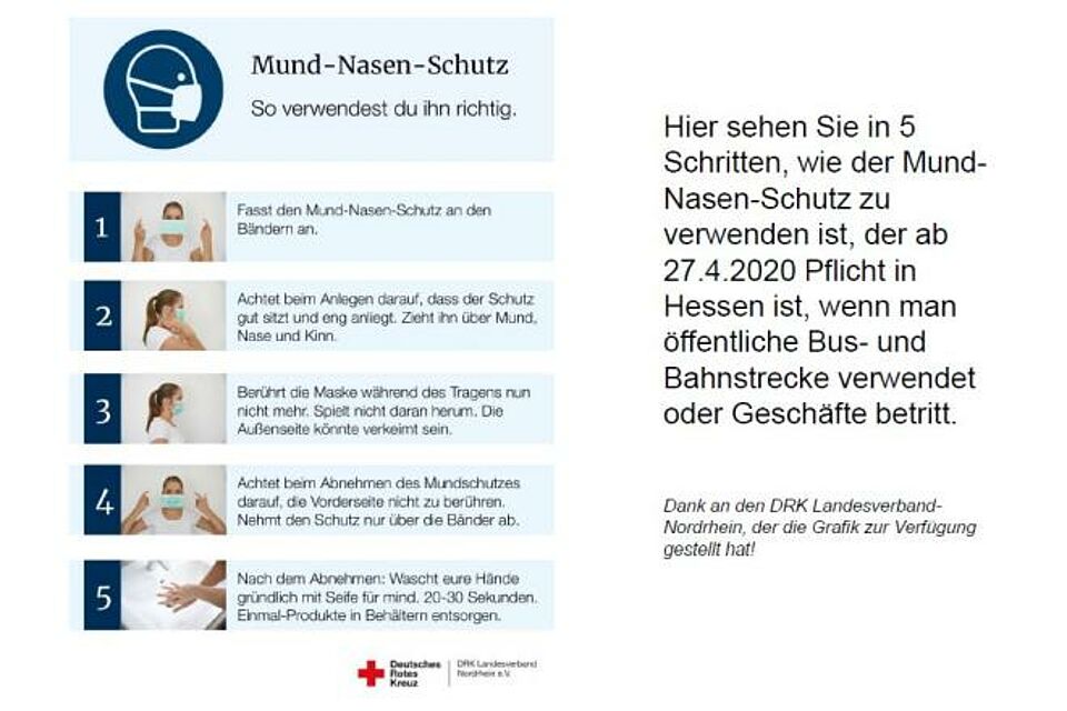 Grafik, die 5 Schritte zeigt, wie man den Mund-Nasen-Schutz anlegt und verwendet. Das Bild wurde uns dankenswerterweise vom DRK-Landesverband Nordrhein zur Verfügung gestellt.